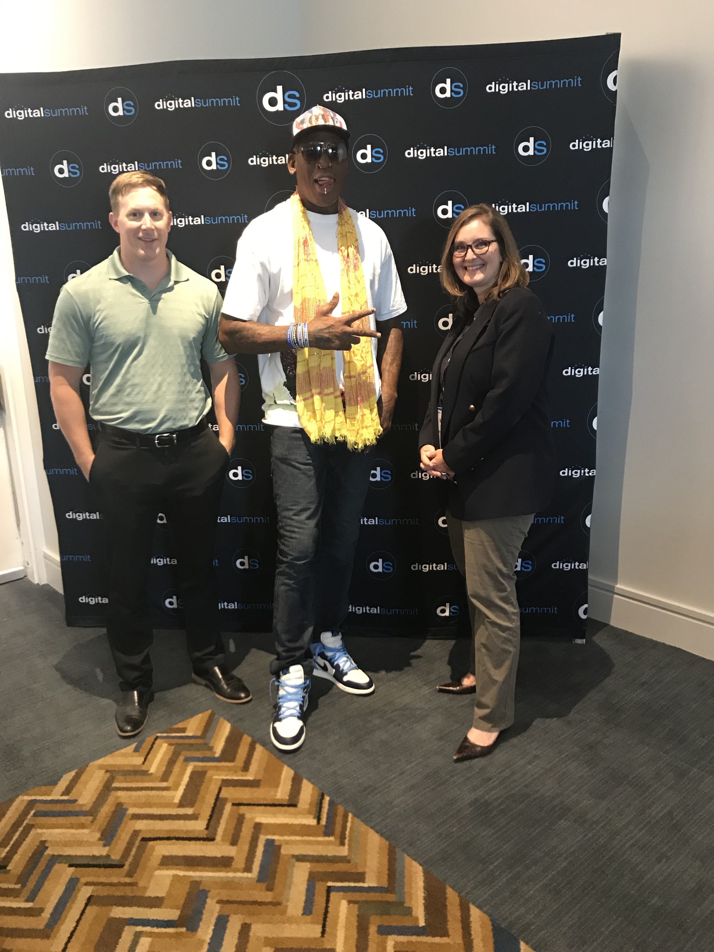 lite prepcenter COO, Steve Bulger and Marketing Manager Rachel North pose with ex-Detroit Piston’s star Dennis Rodman at Digital Summit Detroit.