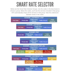 The Smart Rate Selector shipping method groups allow clients to choose the right service options, whether with or without SmartPost and with or without DHL. Below, are the seven shipping method options available to ecommerce retailers: